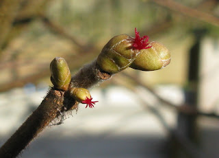 A close up of the female flowers hidden in the buds for protection with just the red styles showing they are wind pollinated.